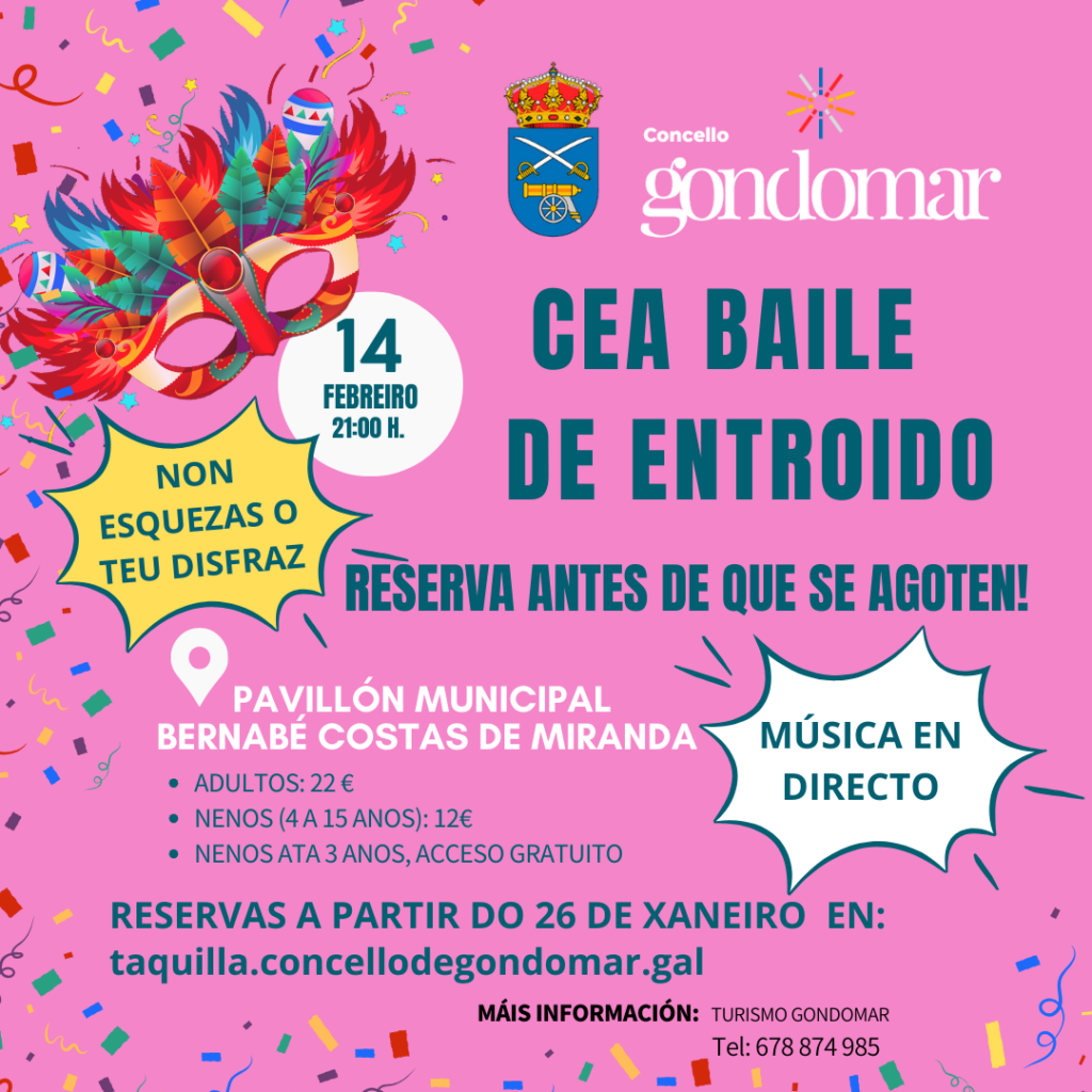 Teatro adultos Cea Baile Entroido 2026 Unha xornada festiva para gozar en familia e con amizades, que terá lugar o sábado 14 de febreiro no Pavillón Municipal Bernabé Costas. Horarios do evento: Apertura de portas: MERCAR ENTRADAS